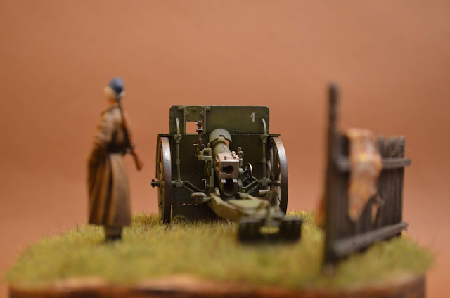 1/35 scale vignette named "Lost and found " featuring IBG howitzer Škoda 100mm model 14/19, modified resin figure converting into late WW2 period Yugoslav partisan , Telomimetico Italian poncho/tent sheet from MedicosD-tails and wooden fence built in scratch.